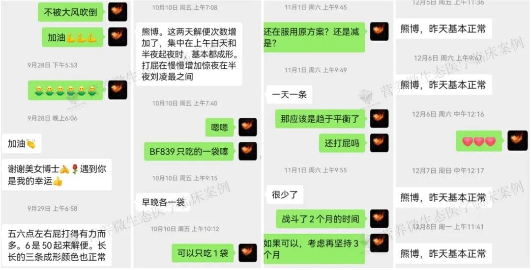 随着调理持续,她的身体逐渐建立起新的平衡。十月中旬的反馈显示,排便与排气已在时间分布上形成规律,且“多”的时段逐步减少,“少”的时段逐渐增加。到十月底至十一月,她已能将益生菌维持在每日一条的维持剂量,排气变得很少。十一月底至十二月初,她的反馈愈发简洁而有力:“每天排便基本正常”。至此,仅半夜偶有排气,每日生活已基本不受影响,标志着这段从剧烈紊乱到重获稳定的调理旅程,终于迎来了扎实而平静的新常态。如今,她每日排便1-3次,大便性状根据布里斯托分类已达理想的4型,生活质量获得了巨大改善。