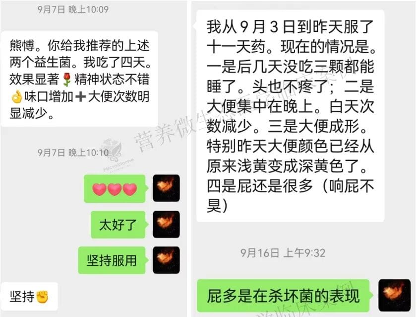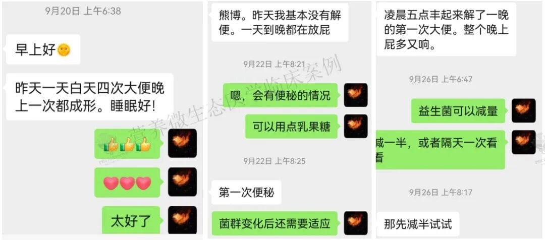2025年9月3日开始服用微生态制剂组合,四天后,患者即反馈精神状态显著好转、胃口增加、大便次数减少,但也出现了失眠这一调整期可能出现的反应。服用十余天后,她可以自己做饭了!仅偶有短暂头痛,仍属赫氏反应范畴。继续服用两天后,睡眠改善,头痛消失,大便开始成形、颜色转为健康深黄色,排便时间趋于规律,但排气依然很多——我向她解释,这很可能是“赫氏反应”,即补充的优势益生菌正在与肠道内原有的有害菌“作战”时产生的暂时现象。她长期的便秘史本就提示肠道菌群失衡已久,排气越剧烈,可能意味着有害菌被清除得越激烈。