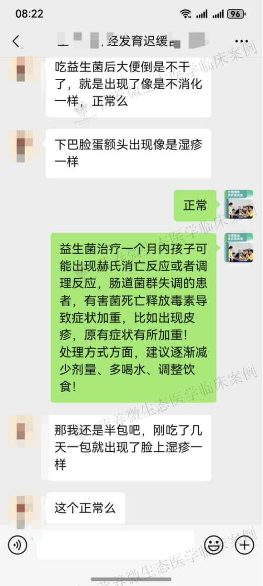 干预过程中,小硕果出现了短暂的“赫氏消亡反应”——身上起了皮疹,还伴有轻微的消化道不适。我向家长解释,这是免疫重建过程中的正常现象,让他们不用焦虑、坚持干预,同时指导他们调整微生态制剂的剂量,密切留意孩子的状态。没过多久,这些不适症状就慢慢缓解、消失了,干预也得以顺利继续下去。