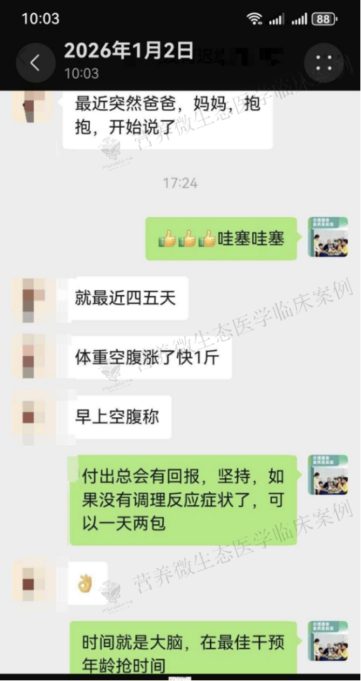 综上,小硕果的康复是精准干预打破病理循环的结果。通过多菌株协同调理肠道菌群、个体化饮食调整及营养素补充,再加上全程监测以及家长的全力配合,其肠道屏障得以修复,菌群回归稳态,神经递质合成与营养素供给恢复正常,最终实现体重增长与语言功能的突破性进展。