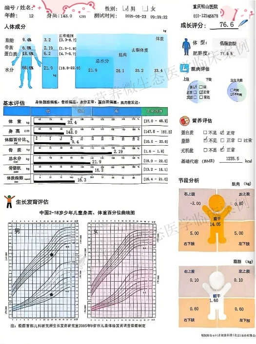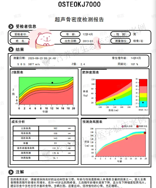 超声骨龄检测显示其骨生理年龄已达14岁4个月,远超实际年龄,提示他的生长发育窗口期可能因长期慢性问题而受到挤压,留给我们的干预时间并不宽裕。