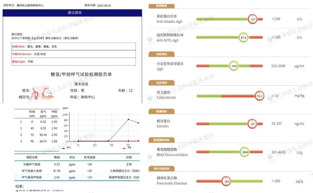 糖氢呼气试验结果给出了一个关键诊断——小肠细菌过生长(SIBO)。呼气氢最大差值高达81.90ppm,远超正常值。这意味着本应相对无菌的小肠内,细菌异常过度繁殖,它们发酵食物,产气导致腹胀,更会窃取本属于孩子的营养,并可能引发全身性的轻微炎症反应。