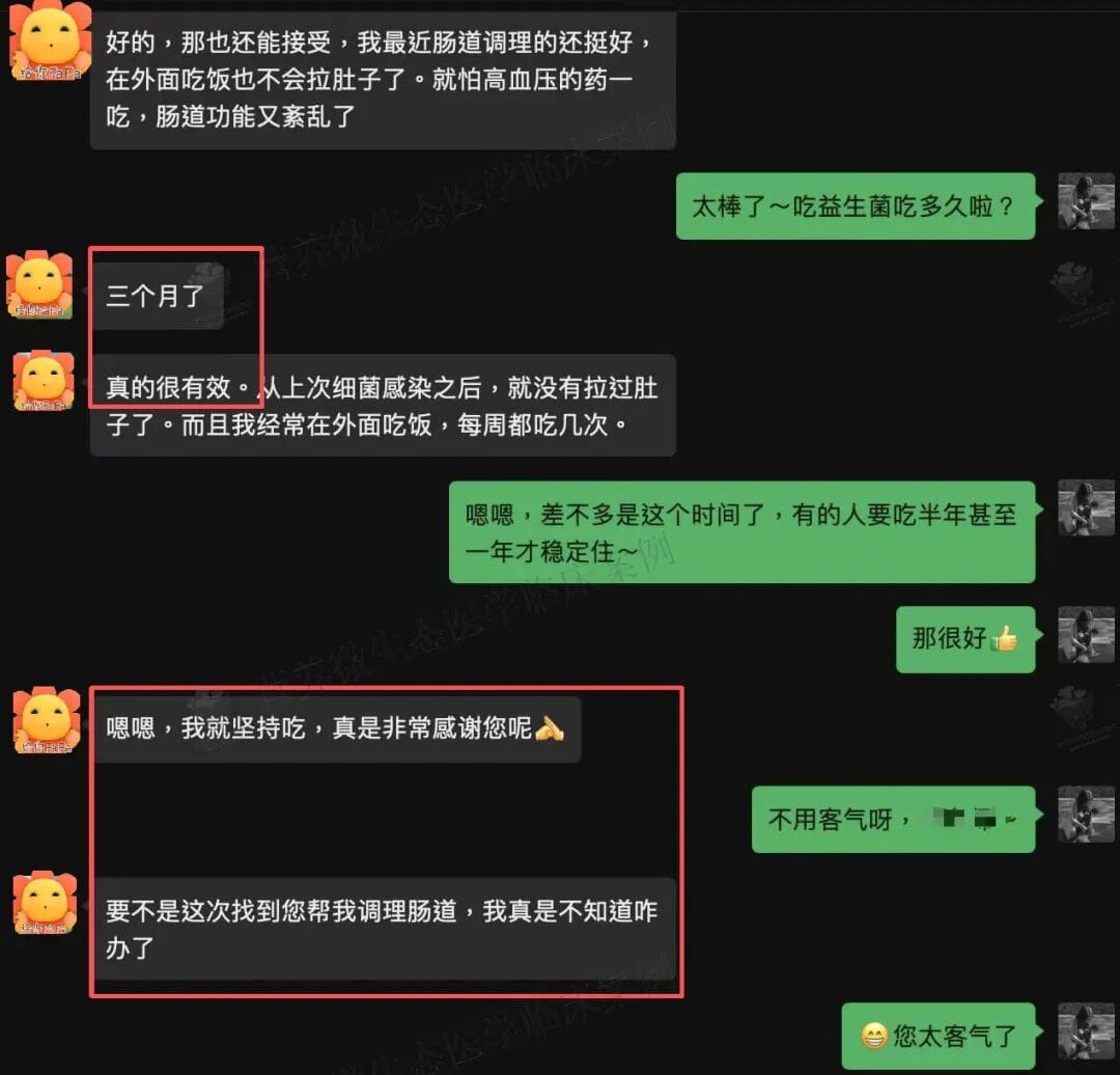 经过三个月的系统调理,许女士的肠道状态变得稳定,即使在每周多次在外就餐的情况下,也不再轻易腹泻。她感慨地说:“我最近肠道调理得还挺好,在外面吃饭也不会拉肚子了,真的很有效……要不是这次找到您帮我调理肠道,我真是不知道咋办了。” 从对每一口食物都心存恐惧,到能够相对自在地享受社交餐饮,这个转变不仅关乎肠道,更是生活质量的显著提升。