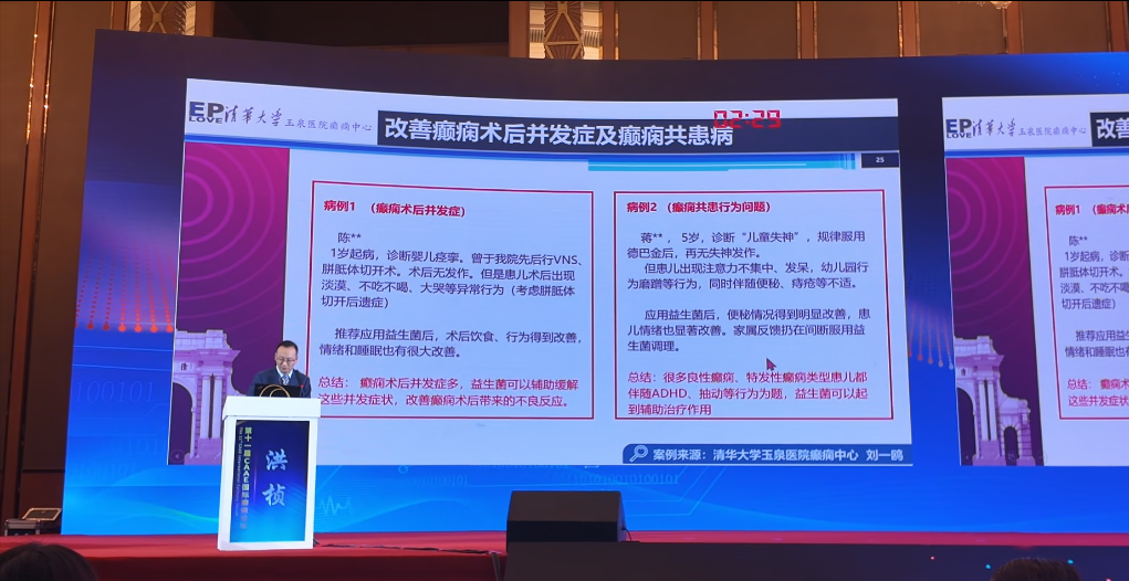 刘旭博士分享全国 13 位医生的案例,如吉林大学白求恩医院难治性癫痫患者加用脆弱拟杆菌 BF839 后,发作频率减少、脑电图改善;首都医科大学三博脑科医院儿童癫痫患者用药无效后,加用益生菌症状减轻;清华大学玉泉医院案例显示其可改善癫痫术后并发症,最长助患者四年未发作。这些案例覆盖 BECT 变异型、癫痫合并孤独症等情况,证实其治疗潜力。